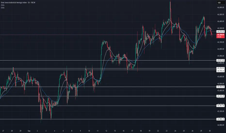 US30 is consolidating after rejecting 46,450, holding above 46,100 support. EMAs are tightening โ market waiting for direction.