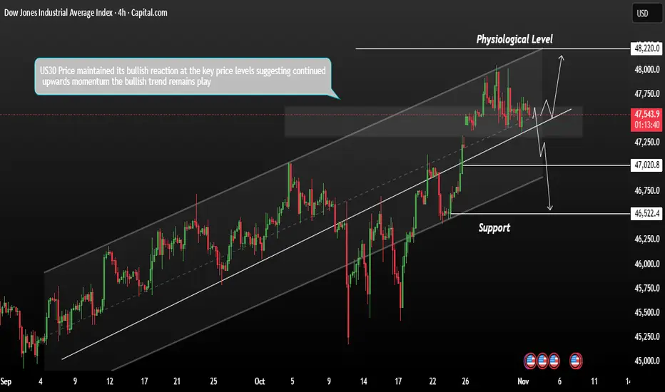 The US30 maintained its bullish reaction at key price levels, suggesting continued upward momentum. As November begins, the index futures gained on Monday, supported by optimism around U.S.–China trade relations and stronger demand sentiment.