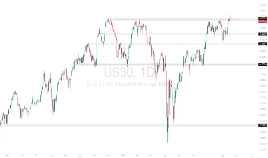 US30 is consolidating just under the 45,000.0 level after a strong rally, showing indecision at this resistance.