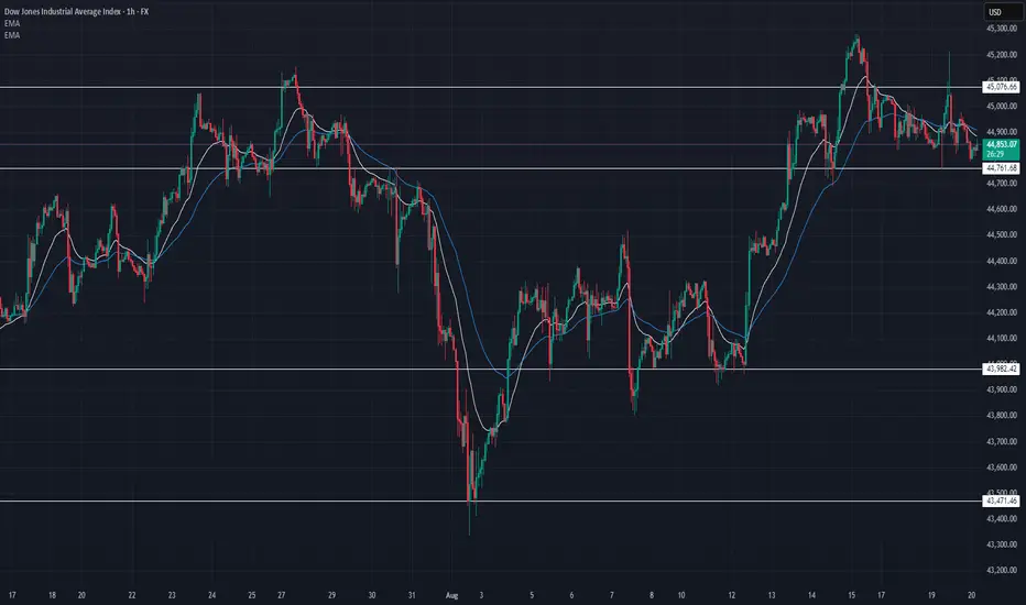 US30 currently trades around 44,860, consolidating after yesterday’s pullback from the 45,200 peak. Price is sitting right above the 44,761 support zone, with EMAs flattening → showing indecision.