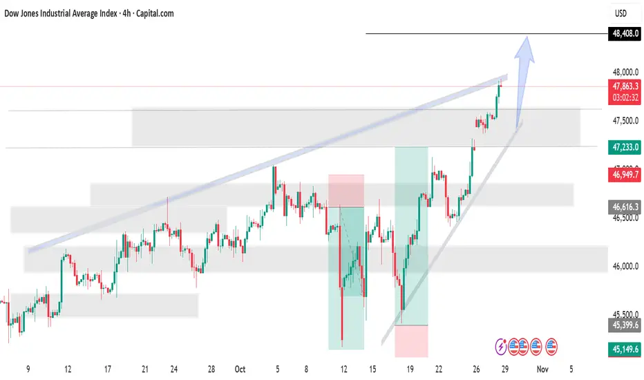 The Dow Jones Industrial Average Index is showing strong bullish momentum breaking above the ascending channel resistance. Price is holding above the 47,800 support zone and aiming toward the next key resistance near 48,400. The clear uptrend structure and breakout projection suggest further upside continuation, with buyers maintaining firm control.