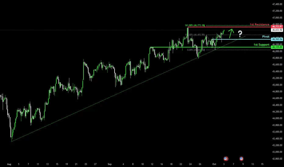 Dow Jones (US30) has bounced off the pivot and could rise to the 1st resistance whch acts as a swing high resistance.