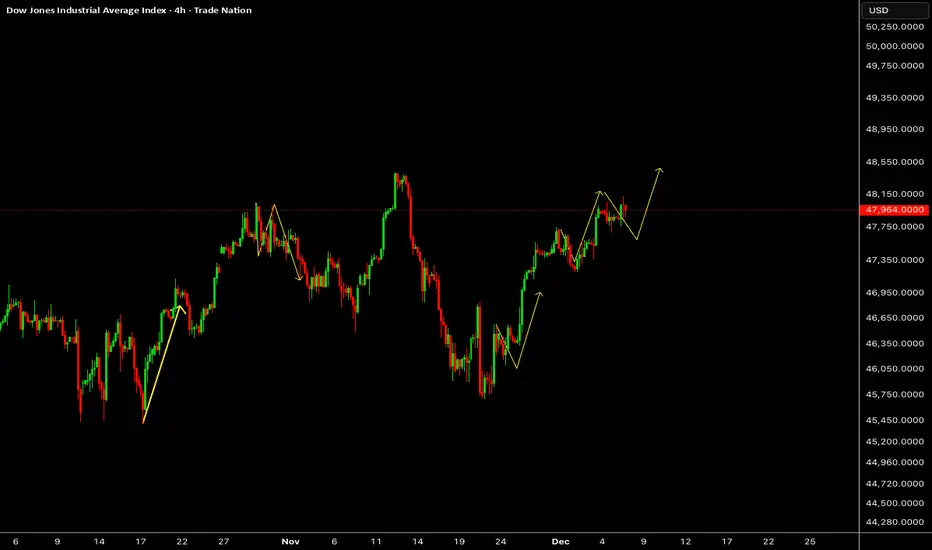 US30 has extended its upward move, but the latest slowdown suggests a developing consolidation phase rather than a completed trend. The structure is shaping into a potential corrective pattern, indicating that the market may still be preparing for another push once this pause finalizes. With momentum moderating, the next decisive move could unfold soon, making this an interesting setup to monitor closely.