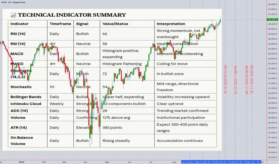 The Dow Jones Industrial Average is trading at 46,785.30, showing consolidation near all-time highs. Multi-timeframe analysis reveals a bullish trend with caution signals emerging on shorter timeframes. Key resistance at 47,000-47,200 zone presents a critical decision point for continuation versus correction.