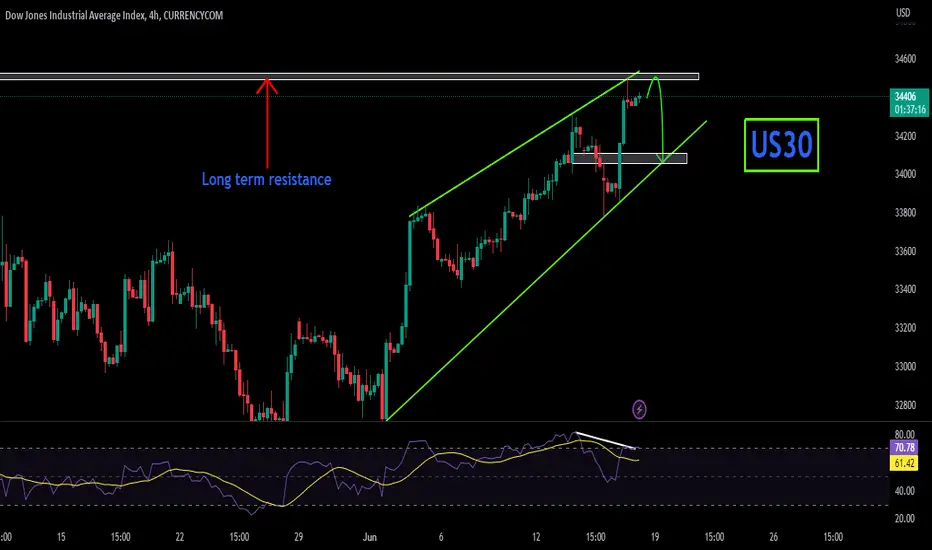 US30 is trading in bullish momentum and facing long term resistance and also created bearish divergence. Will the bearish divergence play its role along with resistance and push the price to downside?