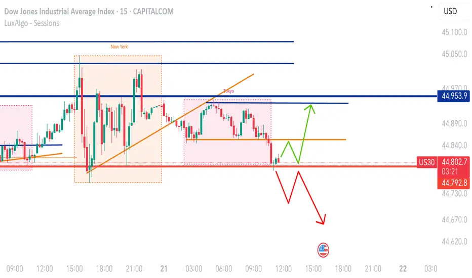 The market is currently ranging within the channel between the 44,953.9 resistance zone and the 44,792.8 support zone I’ve identified. If price breaks below, I’ll wait for a retest before entering. Alternatively, I’ll look to enter on a reversal if a new candle forms within the channel or above the support trendline.