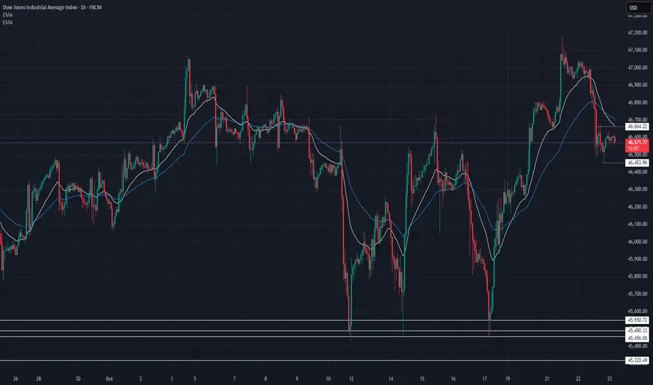 US30 seeing a sharp rejection from the 47,100 area, now consolidating around the 46,600 zone. Bears have regained short-term control as EMAs flip bearish โ momentum slowing after recent upside pushes ๐ด๐