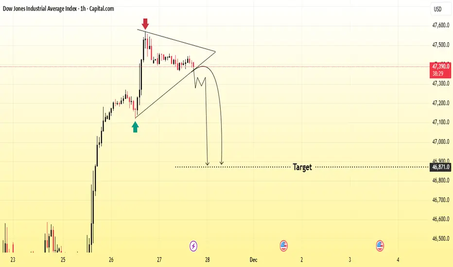 If price breaks below the lower trendline, it may drop toward the marked target zone around 46,800–46,600.