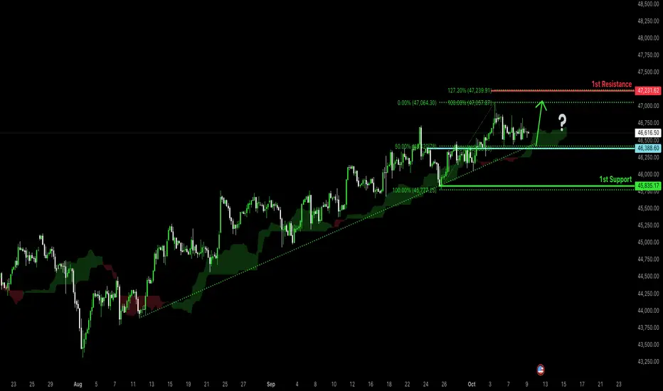 Dow Jones (US30) is falling towards the pivot, which acts as a pullback support that aligns with the 50% Fibonacci retracement and could bounce to the 1st resistance.