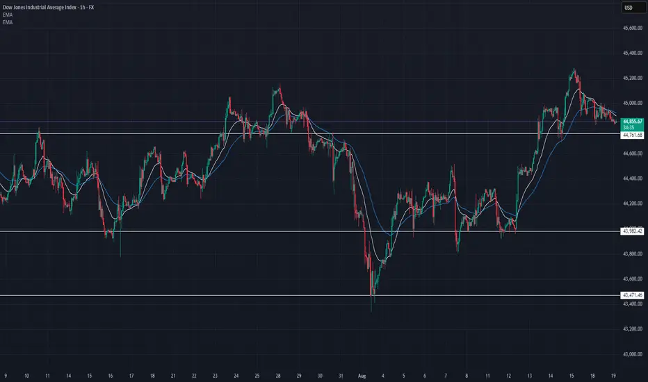 The EMAs are flattening, showing momentum stalling. If 44,761 gives way, bears could press back toward 43,982. Bulls must reclaim 45,000โ45,200 to regain control.