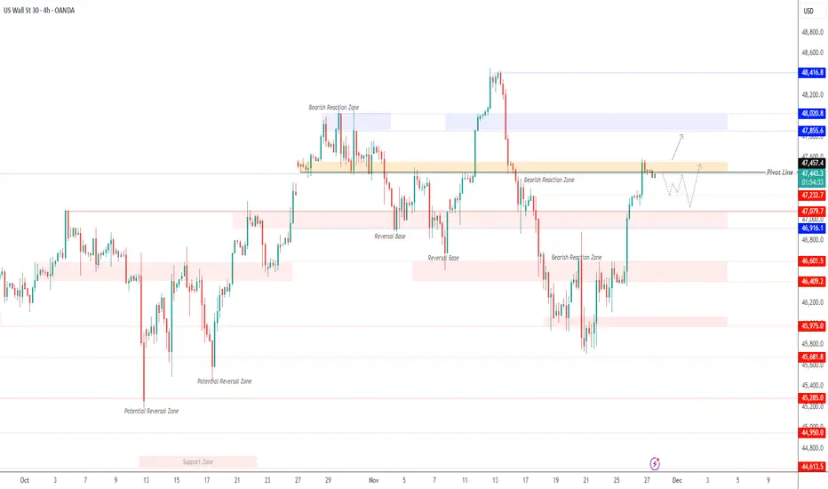 As long as the price trades below 47460, US30 may continue a bearish correction toward 47240 and 47080.