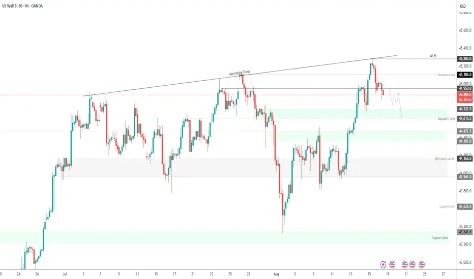 A 4H close above 44950 would shift the bias bullish toward 45100 and 45285.