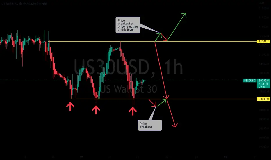 US 30 daily analysis on 1H chart. the market is still bearish and currently is moving sideways. one will need to wait for a price to breakout before one can act.