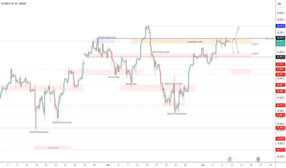 A confirmed breakout above 48020 would turn the structure bullish, targeting 48410.