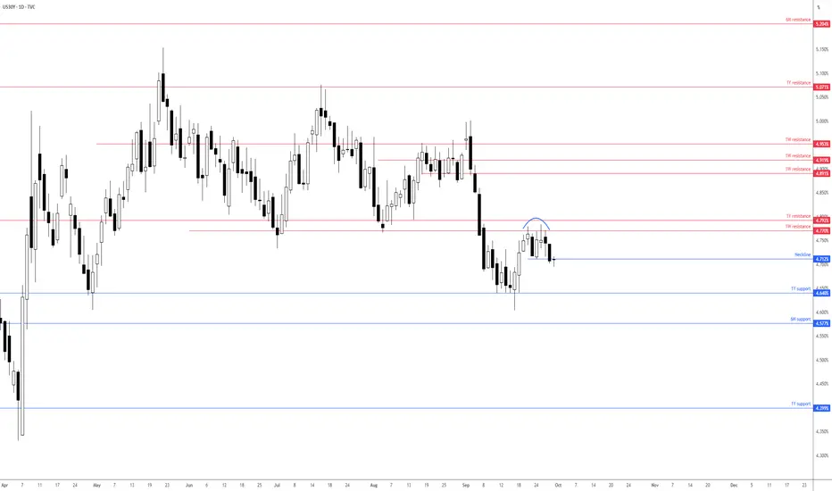 As can be seen from the chart below, price action continues to respect resistance between 4.792% (1Y) and 4.770% (1W), which has also seen flow move below the neckline of a double-top pattern at 4.712%.