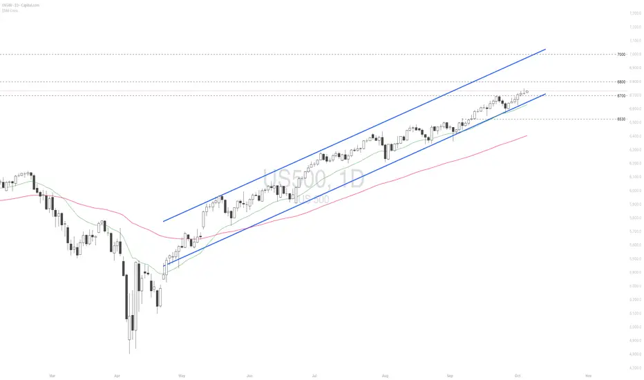 US500 extended its rally to a new record high, maintaining a solid uptrend within the ascending channel. The diverging bullish EMAs point to the potential continuation of bullish momentum. If US500 breaches above the psychological resistance at 6800, the index may gain upward momentum toward the next psychological resistance at 7000. Conversely, if US500 breaks below the support at 6700, the index could retreat toward 6530.