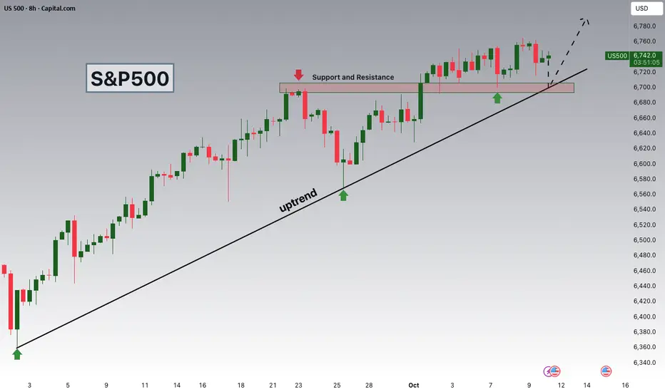 In today’s session, we’re keeping a close eye on US500 for a potential buying opportunity around the 6,700 zone. The S&P 500 remains firmly in an uptrend, with price currently in a healthy correction phase approaching a key support and trend confluence near 6,700.