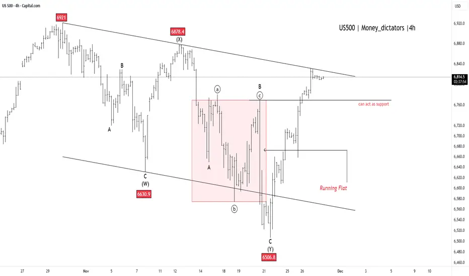US500 suggests the market has put a definitive end to its recent downward movement, signaling that a major bullish trend is set to continue. This complex correction, which the chart labels as complete at the 6506.8 low, looks resolved. The index has since staged a powerful rebound and is currently pressing right up against the major upper trendline resistance, which defined the limits of the entire corrective phase.