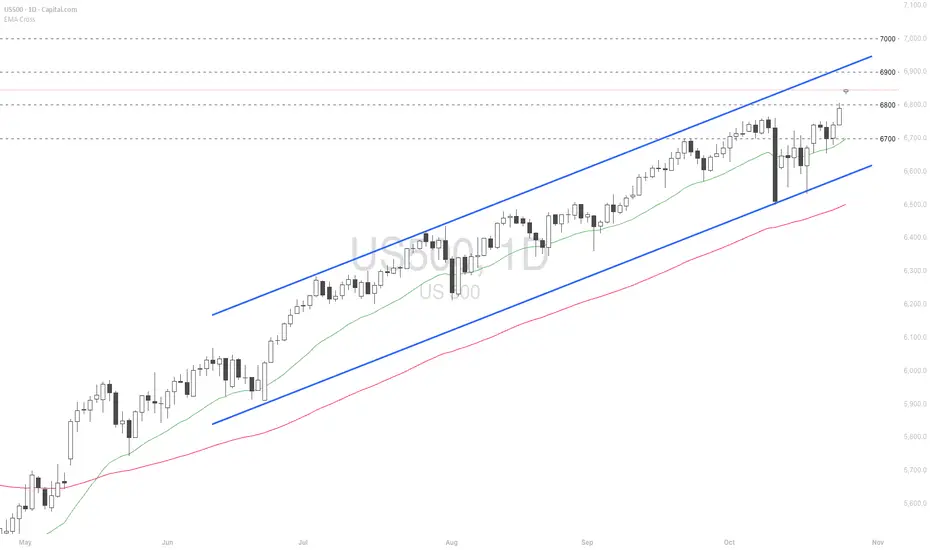 The S&P 500 remained within the ascending channel, reaching a new high at 6,800. Diverging bullish EMAs suggest that the bullish structure may extend further. If the index closes above 6,800, it could advance toward 6,900. Conversely, a drop below 6,800 may lead the price to retreat toward 6,700, which coincides with EMA21.