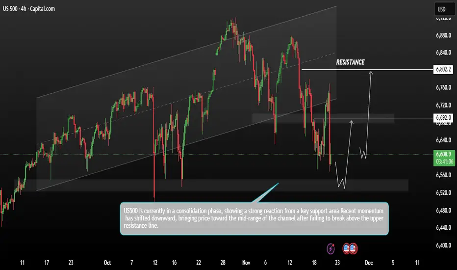 US500 price action moving within a broad ascending channel, with multiple touches on both the upper and lower trend boundaries. Recent momentum has shifted downward, bringing price toward the mid-range of the channel after failing to break above the upper resistance line.
