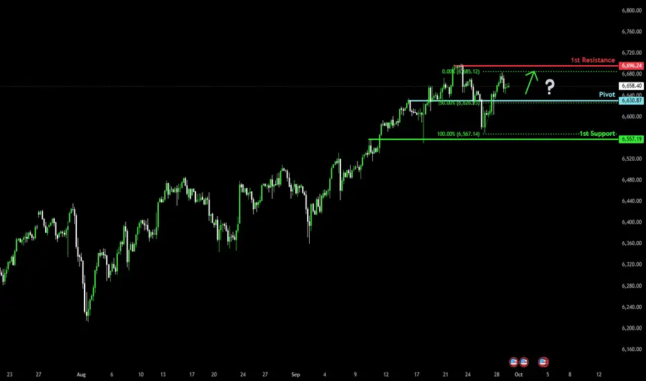 S&P500 (US500) is falling towards the pivot, which acts as an overlap support that aligns with t e 50% Fibonacci retracement and could bounce to the 1st resistance which has been identified as a swing high resistance.