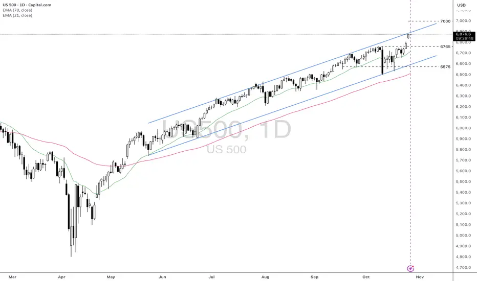 - Tech earnings and the upcoming FOMC decision are key catalysts that may influence future US500 moves. Broad sector participation and ongoing AI investment could sustain upward momentum if macroeconomic conditions remain supportive.