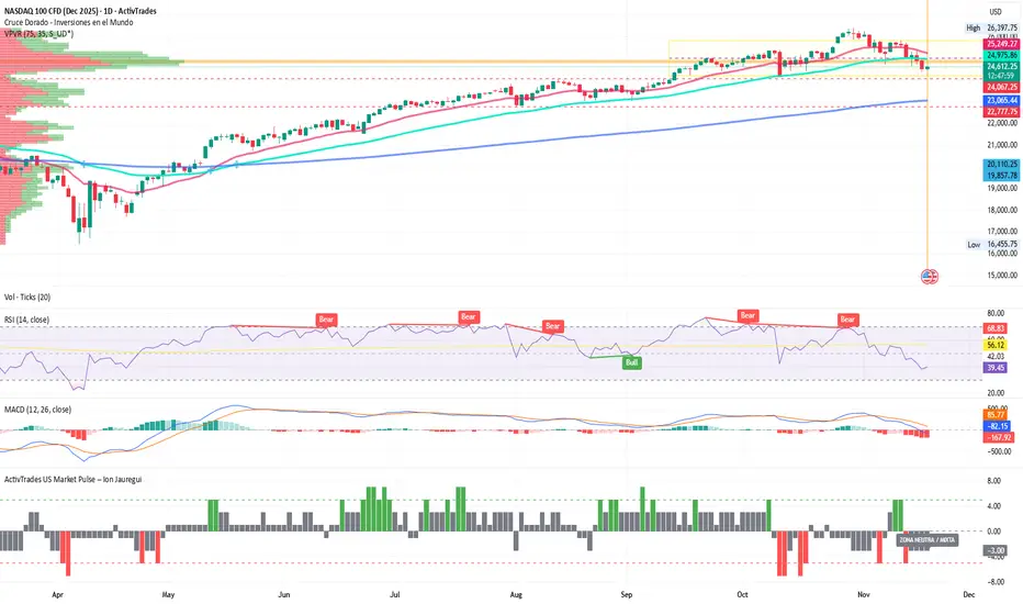 The Nasdaq 100 maintains a long-term bullish structure, but in recent sessions it has encountered significant resistance after reaching an all-time high at 26,397.75 points, forming a range between 25,828.75 and 24,192.66 points, a recurrent zone since the beginning of the quarter.