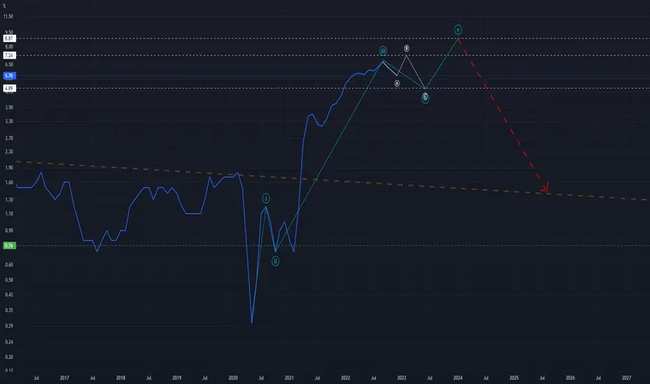 It would be awesome if TradingView offered a candlestick chart for CPI but considering its only updated once per month, maybe the line graph/chart is the best option (not sure how that works). As for the data available to me, I've done a best effort markup using the science of Elliott Wave Theory. Considering the fluctuations seen on the M(onthly) chart, I believe its possible that CPI is sitting in the midst of a shallow Wave 4 correction. With this in mind, I find it possible that the number stretches into the low-mid 7.xx range between now and March. From there we may see a 2023 low within the 4.xx level.
