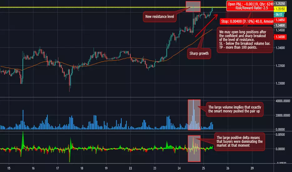 The pair demonstrated a keen growth and broke out the resistance level, which is a great bullish signal. The move was on the large volume, so that we may assume that the smart money pushed the price up. It increases the possibility of the further surge. Furthermore, the large positive delta means that buyers were dominating the market.