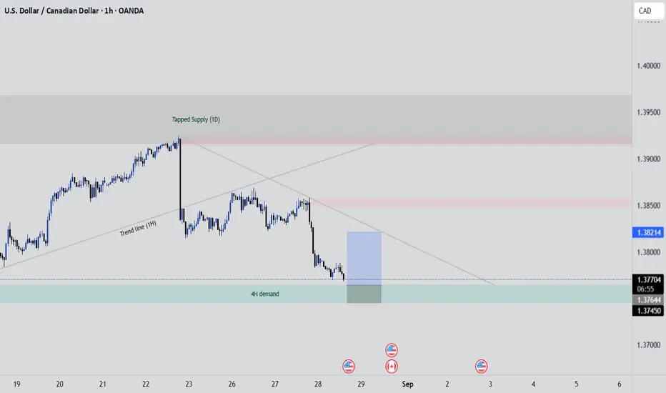 The price is near demand zone of 4H , which is actually strong one. The price is bearish in lower time frame So this trade is against the trend but with confluence , Price need a good pull back to fill order from lates supply and to break support + demand zone to continue bearish momentum. So we are targeting most recent supply zone and by staying below the trend line. The R:R is 1:2.5 so its good for me.
