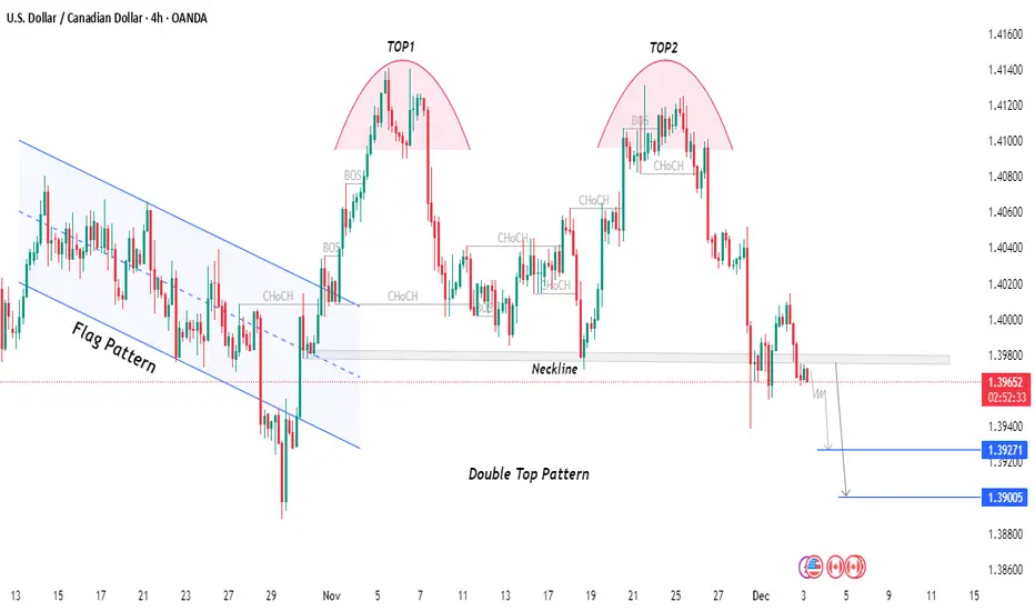 USDCAD has completed a Double Top Pattern after failing to break above the 1.4100 region twice. Price has now broken below the neckline, indicating a potential shift toward a bearish continuation.