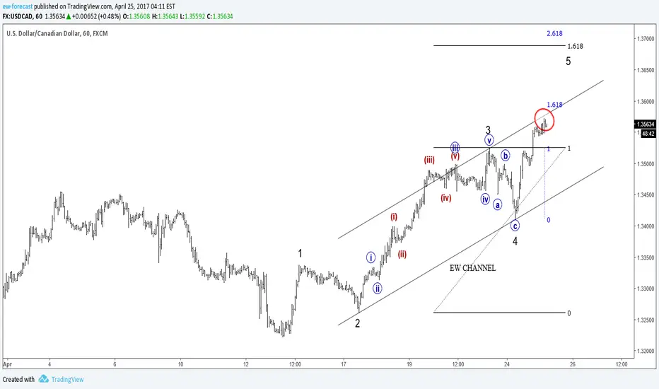 USDCAD is moving nicely higher since April 12 where pair showed us signs of a bottom because of an impulsive turn into wave 1. So we were bullish on USDCAD, but these move can be coming to an end now because of price advance into a fifth wave; final leg of an impulsive structure. Also, we see pair at upper resistance line of an EW channel which can represent first resistance near 1.3580, while next one is seen near 1.3680.