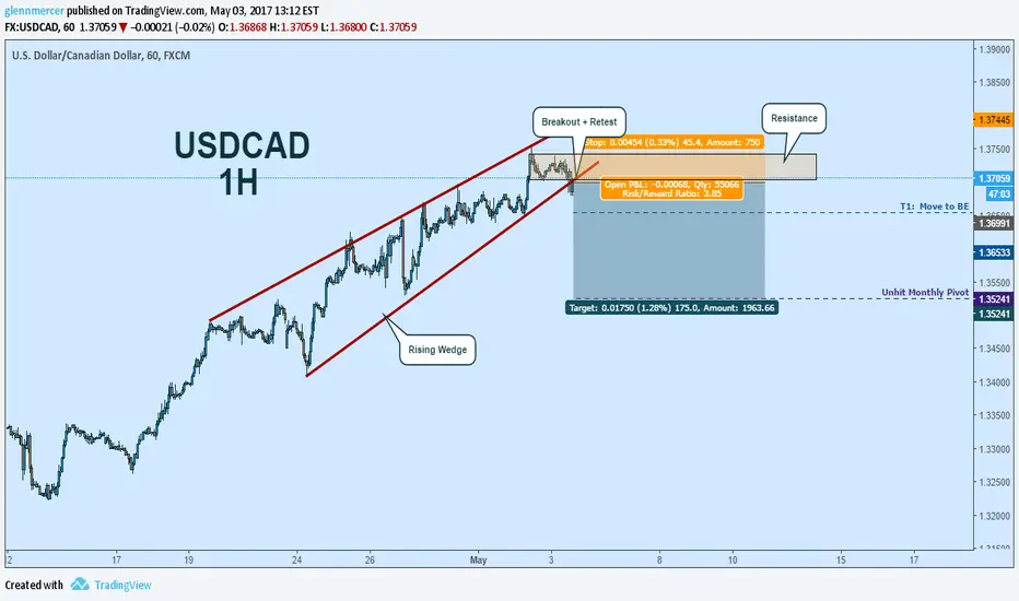 Hello traders, looks like USDCAD may break out of its rising wedge. As expected we are seeing some volatility surrounding the FOMC minutes but the pair seems to be consolidating below the breakout line. Breakeven at 1:1 with a nice R/R for final target. Cheers