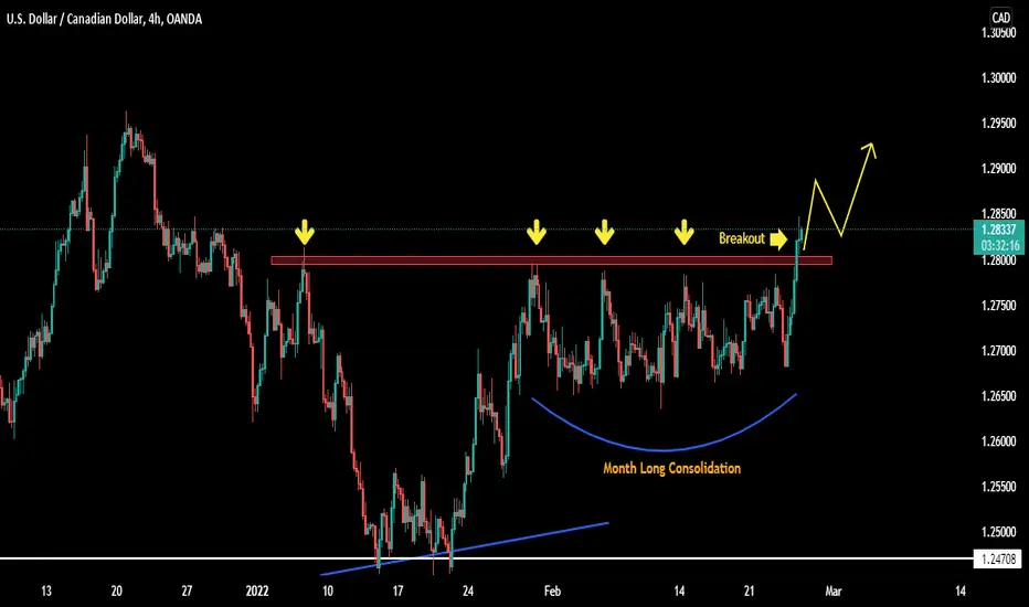 USDCAD has been in a month long consolidation and has given a breakout from it. Bulls are ready to charge from here and 100 pips are in sight.