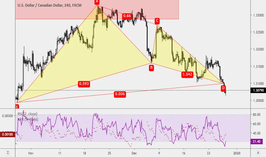A bullish Gartley is waiting for a complete setup. The aggressive trader can wait for a double bottom on the 1-hourly chart for a buying opportunity, the conservative trader could wait for the confirmation of the Potential Reversal Zone(PRZ) for a buying opportunity.