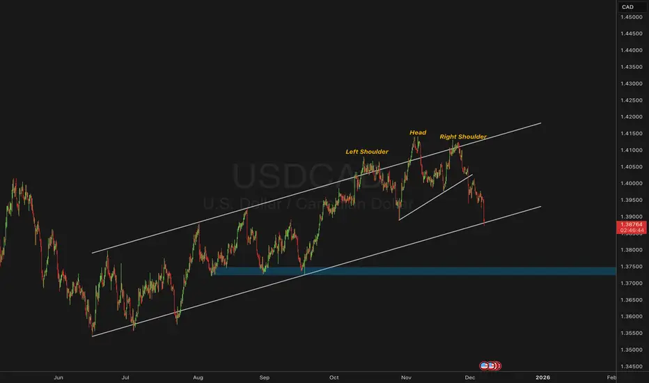 USDCAD’s clean break of a six-month rising channel shifts focus to 1.3750 as the next major area of interest — a zone that may decide whether this is a trend reversal or simply a deep correction within the broader structure.