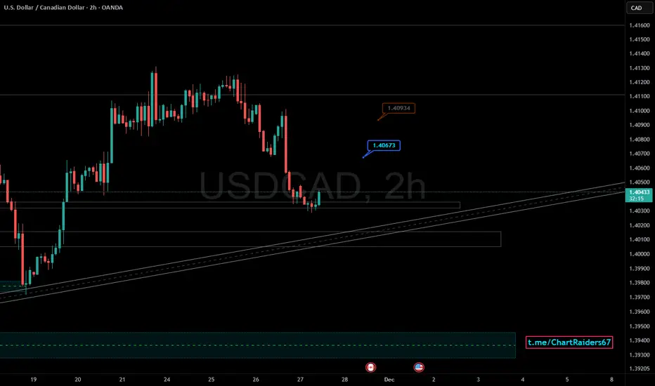 USDCAD is reacting to a key support zone aligned with the ascending trendline. As long as this area holds, a pullback toward 1.4067 and potentially 1.4093 is likely. A clean break below the support box would open the way toward the lower demand zone around 1.3940–1.3925.