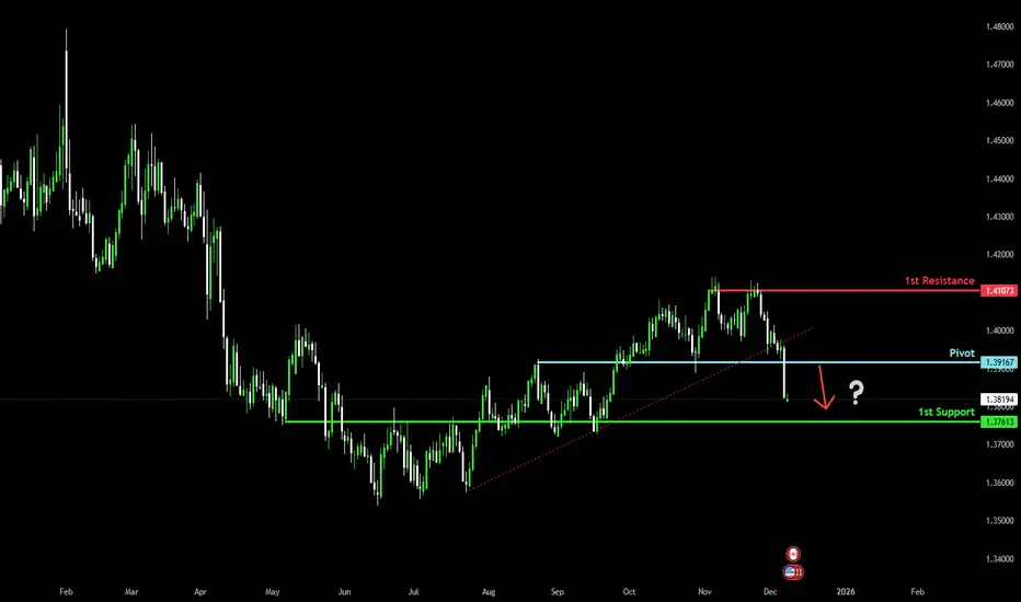 Loonie (USD/CAD) could rise to the pivot, which acts as an overlap resistance, and could reverse to the 1st support, which has been identified as an overlap support.