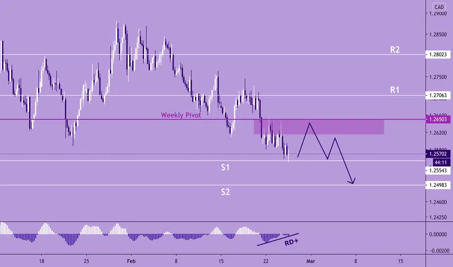 We have a downtrend in all time frames and price is below the weekly pivot and also below the EMAs with three different periods (20, 50 & 100). I just hide the EMAs because I didn’t want to make the chart untidy! Price is testing the first support level (1.25540). MACD shows a regular positive divergence which means there would be a upside push. I expect a rejection from this level and a bounce to the up to the supply zone (purple triangle). Then, IF there was any rejection by the supply zone in the lower time frames, we can expect the price to fall again and break the S1 which can be the first target and then falls more to the S2 as our second target. What do you think about USDCAD?