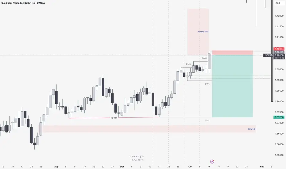 Price has tapped into the monthly FVG (Fair Value Gap) around the 1.4050 area, aligning with a potential liquidity sweep above the previous week’s high (PWH).