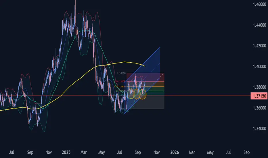 USDCAD currency pair recently reversed from the support area between the pivotal support level 1.3715 (which has been reversing the price from the start of August) and the lower daily Bollinger Band.