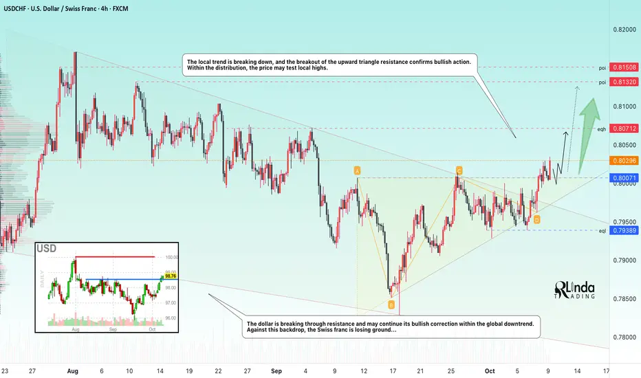 The dollar is breaking through resistance and may continue its bullish correction within the global downtrend. Against this backdrop, the Swiss franc is losing ground...