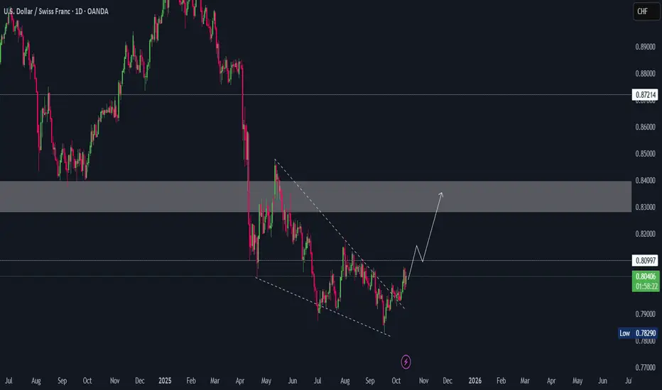 The U.S. Dollar vs Swiss Franc (USD/CHF) pair is showing early signs of a structural shift, trading near 0.8040 after forming a solid base around 0.7829, its recent multi-month low. Price action has transitioned from a prolonged bearish phase into a potential reversal pattern, suggesting a medium-term bullish continuation.