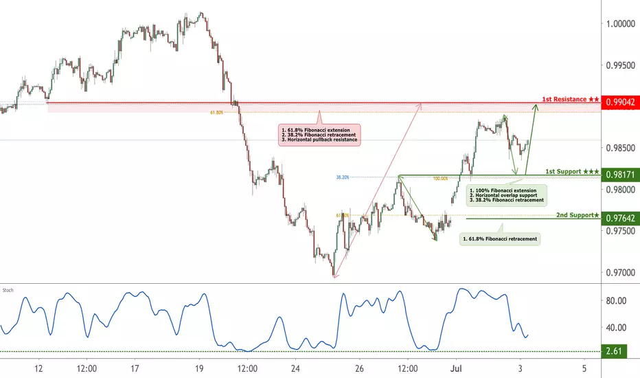 USDCHF is expected to drop to 1st support at 0.98171 where it could potentially react off and up to 1st resistance at 0.98171.