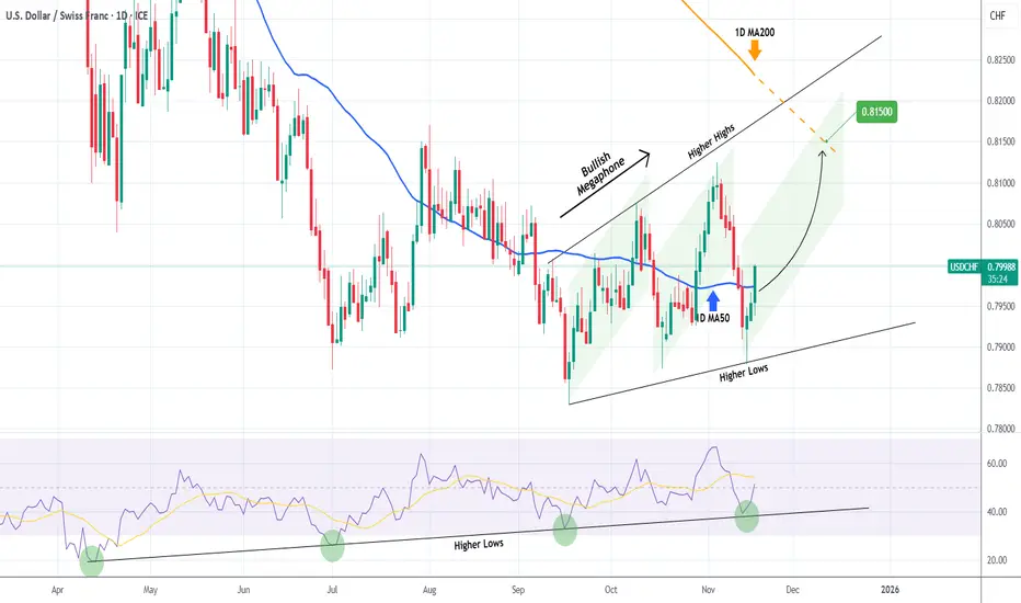 The USDCHF pair has been trading within a 2-month Bullish Megaphone that was initiated after the huge 1D RSI Bullish Divergence of Higher Lows caused a market bottom in September and the price flipped the Lower Lows to Higher Lows and started rising.