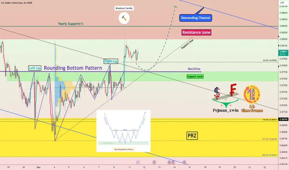 🏃♂️USDCHF has been moving in the Descending channel for a long time, but USDCHF started to increase by hitting the 🟡Price Reversal Zone(PRZ)🟡and managed to form a Rounding Bottom Pattern.