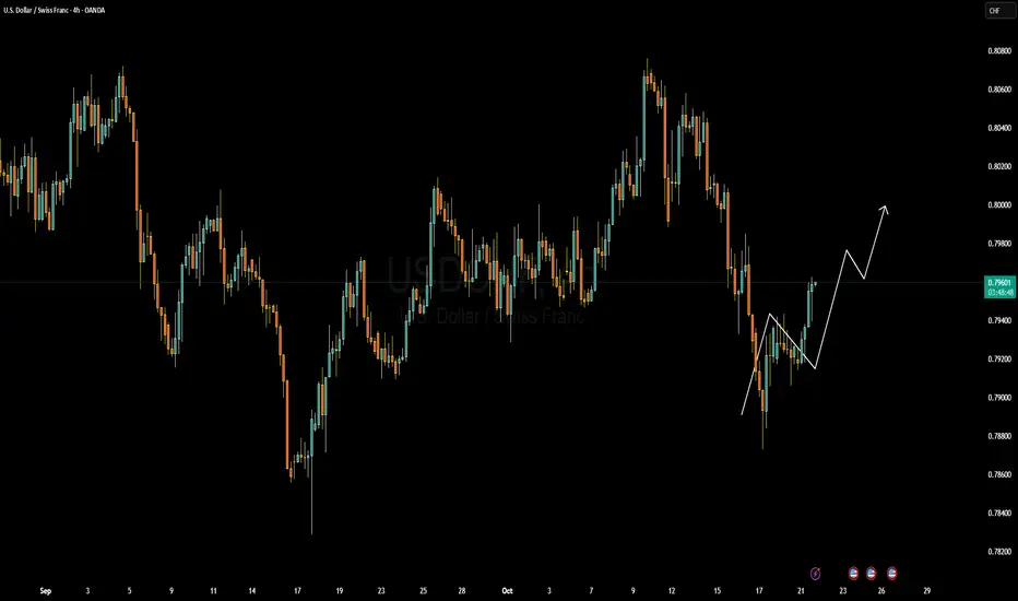 USDCHF on the 4H timeframe is currently showing signs of a bullish reversal after forming a short-term corrective flag pattern. Price action indicates that buyers have stepped in around the 0.7900 region, creating a strong base of support. The recent breakout from the minor descending channel signals renewed bullish momentum, with the pair likely to target the 0.8000 psychological level in the coming sessions if momentum sustains.
