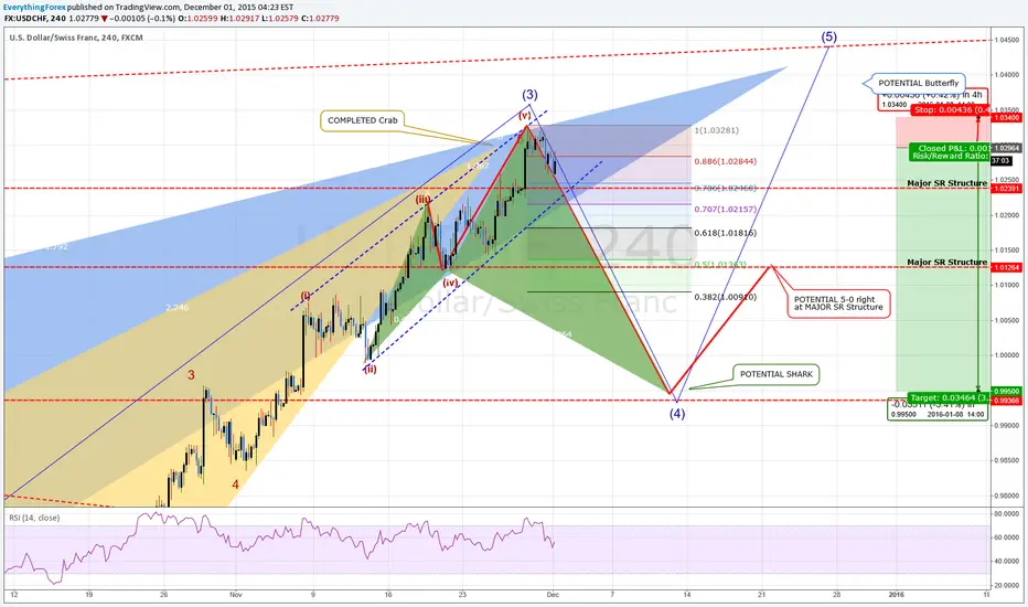 There is a COMPLETED Crab pattern that seems to have marked out the end of the wave (3). What I also have on the chart is a classic Potential Shark pattern with a POTENTIAL 5-0 pattern in the waiting as well. When patterns coincide with structure, it makes them that much more relevant. From my chart, you can see that the placement of the points of the Shark and the 5-0 makes sense in that they coincide with structure. The Shark would complete near a MAJOR Structure and the 5-0 also completes near a MAJOR Structure.
