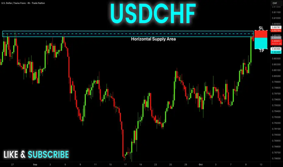 USDCHF taps into the horizontal supply area where Smart Money distributes orders. Liquidity above previous highs has been swept, confirming bearish intent with downside target at 0.8046 as imbalance fills. Time Frame 4H.