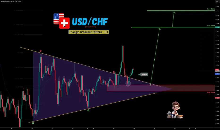 ✅USD/CHF has formed a clear symmetrical triangle on the H1 timeframe, showing prolonged consolidation and price compression. After multiple rejections from descending resistance and higher lows building at support, price has now broken above the upper trendline — signaling a potential bullish continuation move.